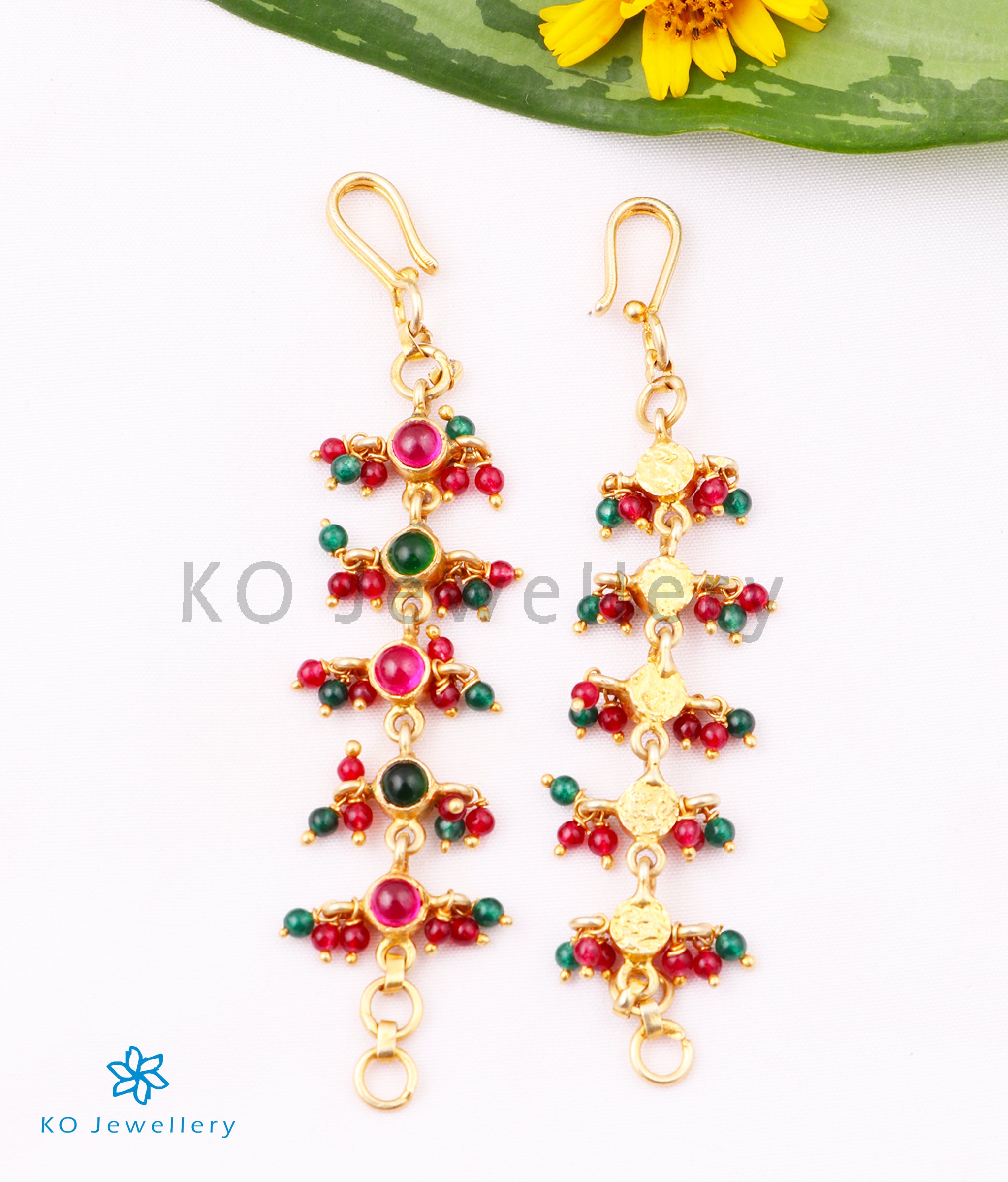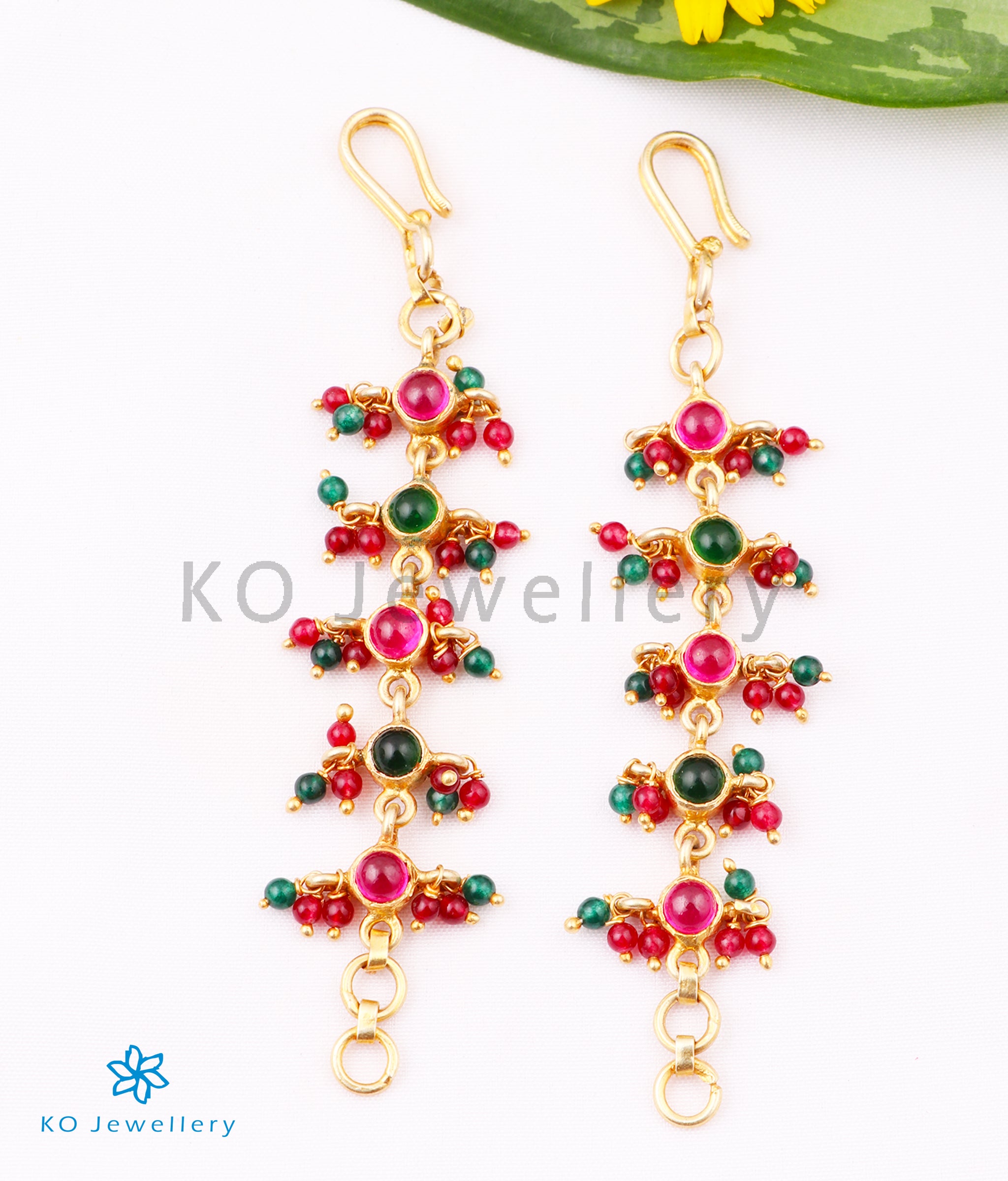 This pair of unique design matil or kaan chain is handcrafted in Sterling silver (92.5%) and decorated with kemp stone and gold-dipped. Pair it with your traditional outfits, or style them with your indo- western outfits they look stunning . The length of this earchain can be customised to be made shorter or longer, contact us if you require customisation.