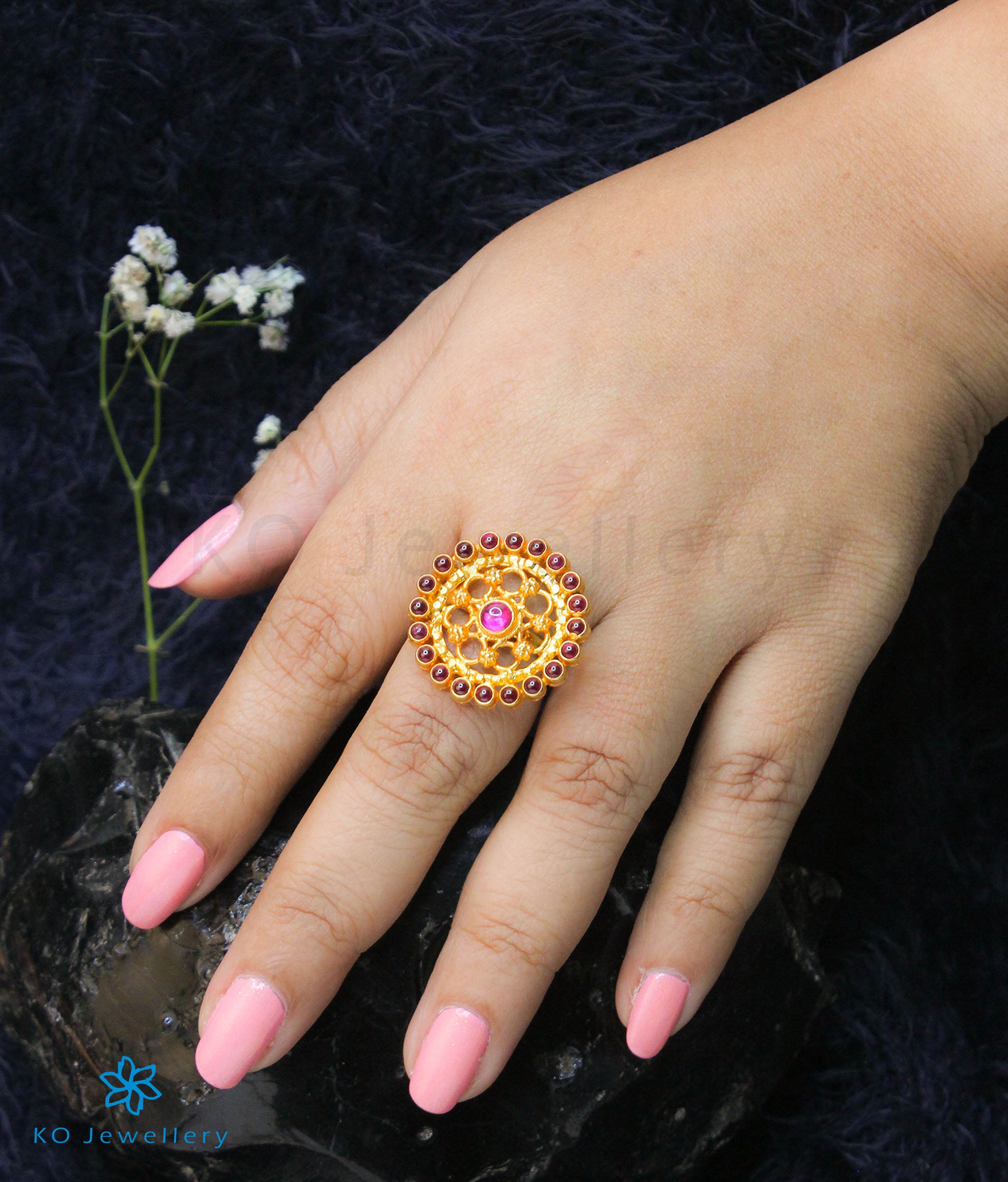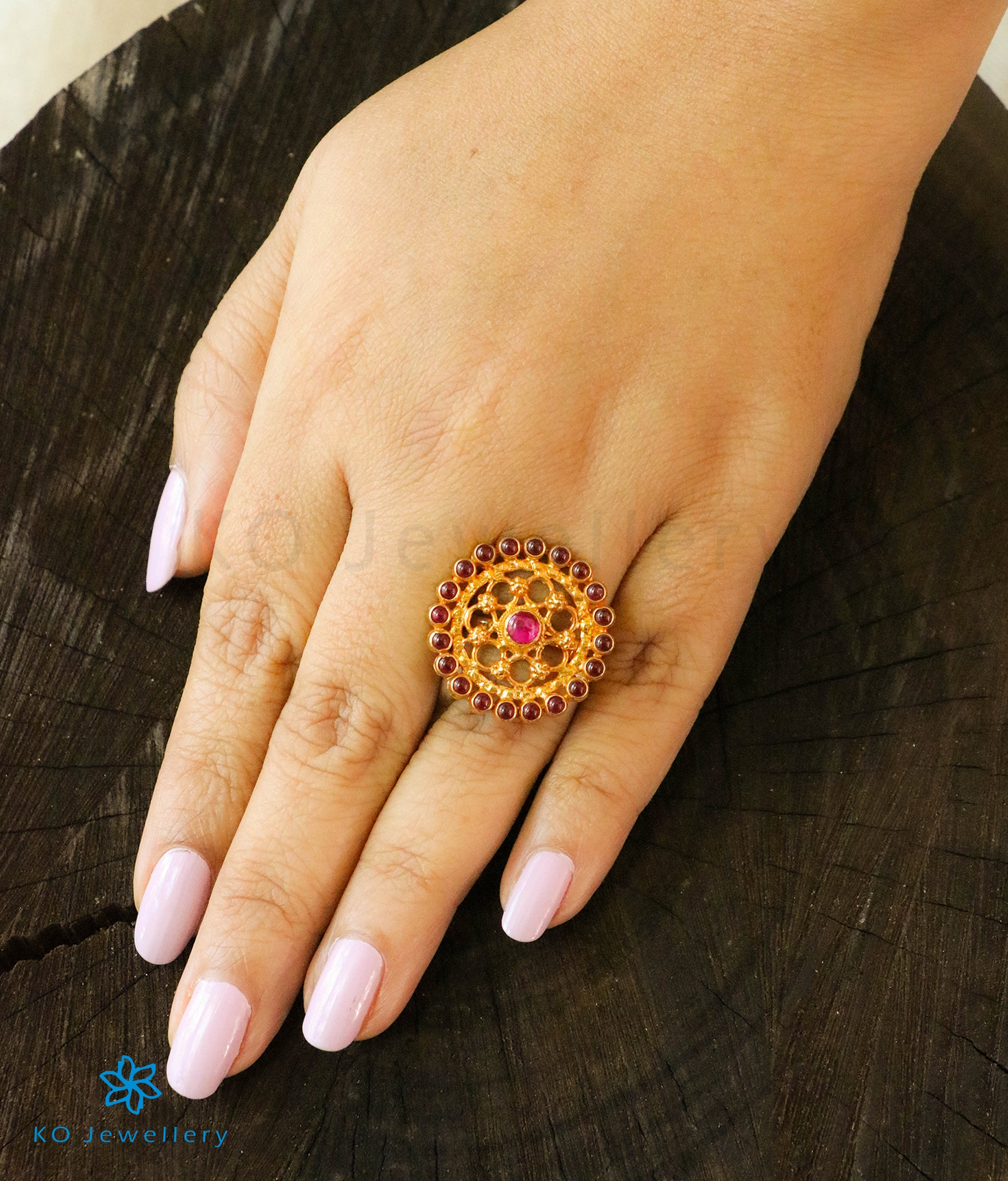 This ornate kempu stone finger ring is truly a head-turner. Crafted using techniques used in ancient South Indian antique temple jewellery the entire piece is crafted in pure Sterling Silver (92.5%) and gold dipped . This ring is adjustable according to the size of your finger.