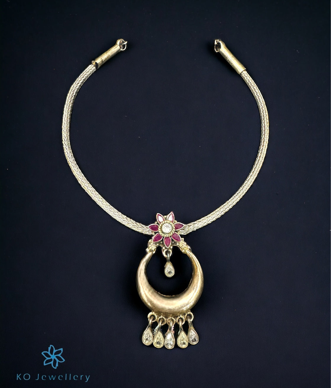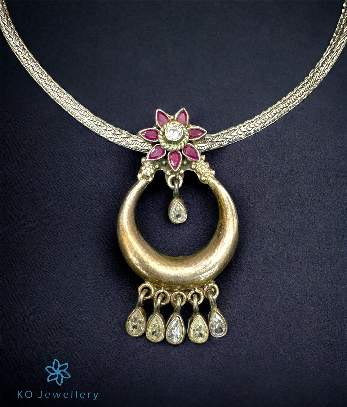 A pretty necklace with a gemstone studded pendant in a tear drop shape handcrafted in Sterling Silver (92.5%) . This necklace can be paired effortlessly with indian or western wear.